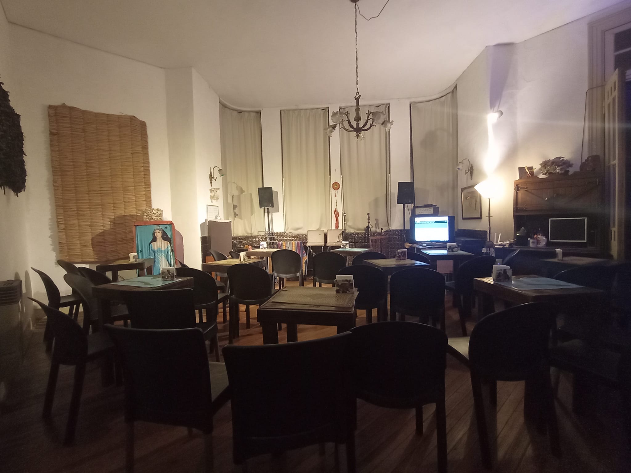 El espacio está equipado con sillas dispuestas para recibir al público en un entorno familiar, ideal para eventos de pequeño formato.